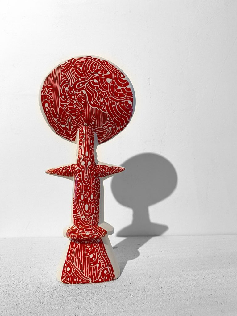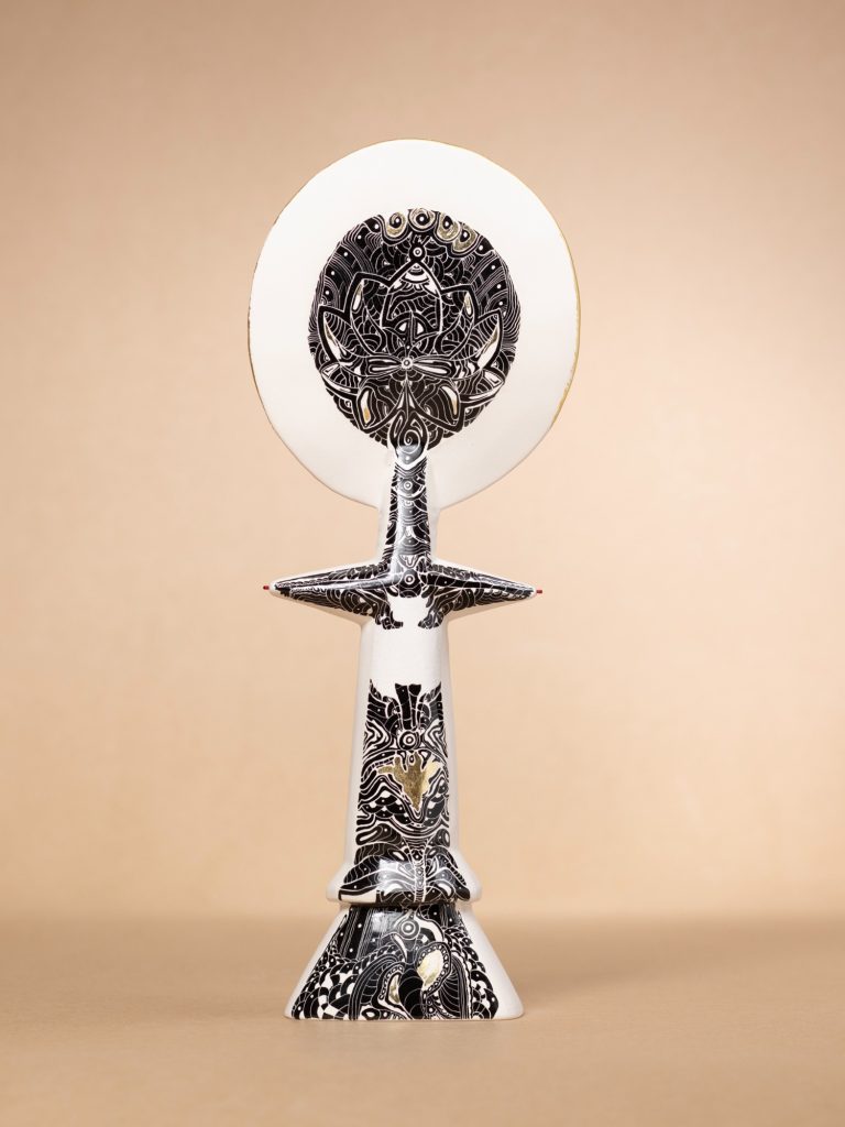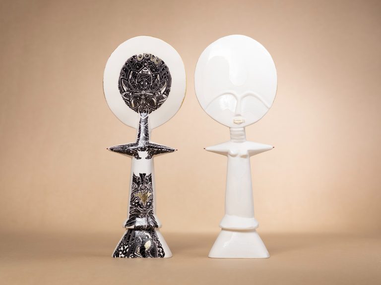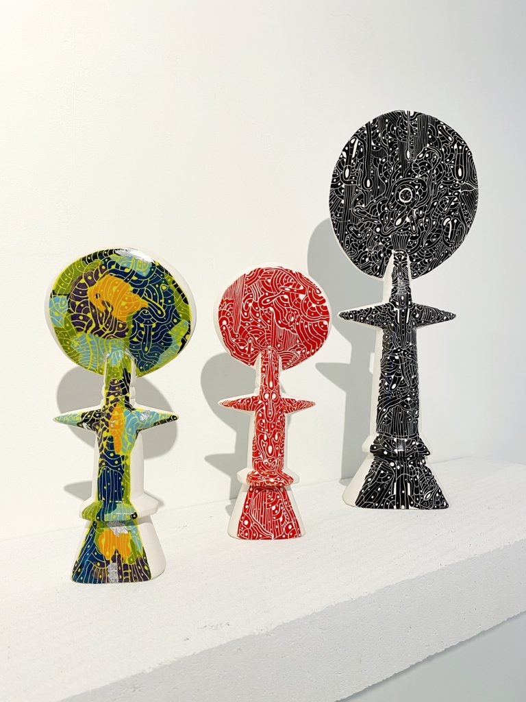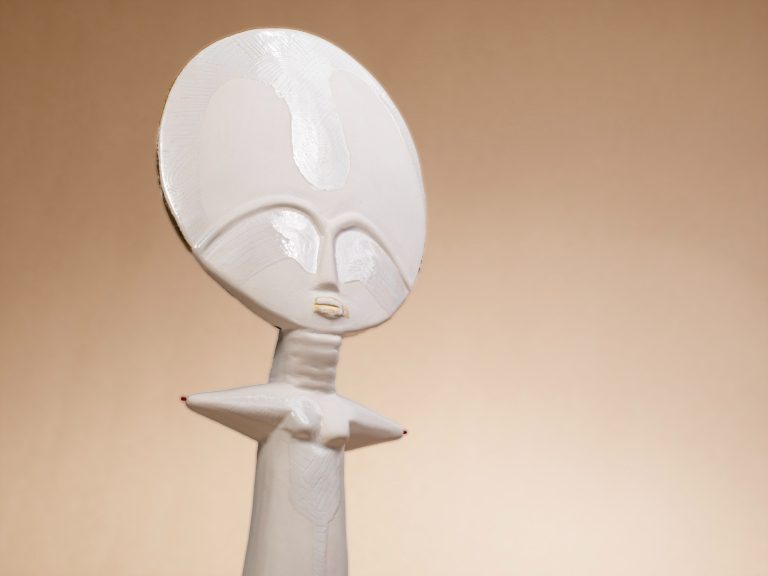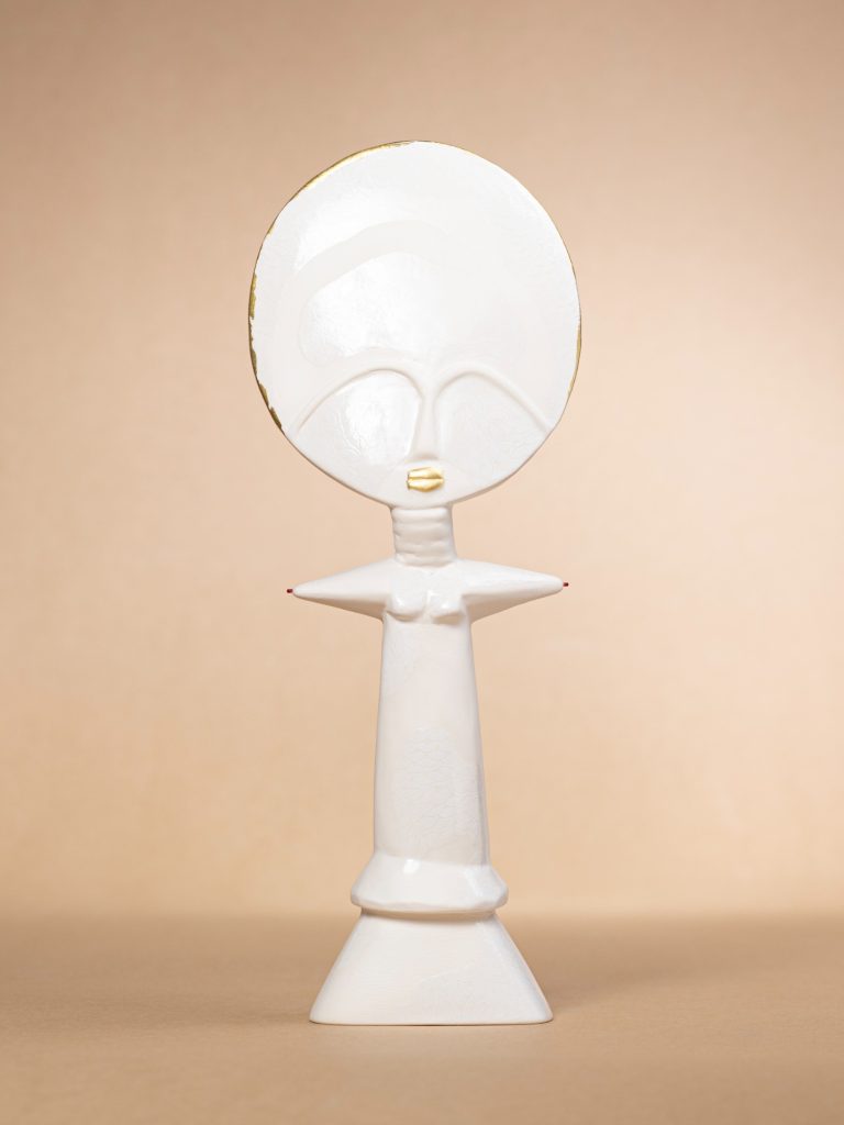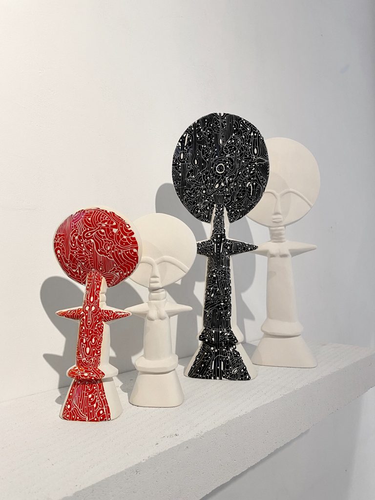 Ubuntu, is an exploration of origin, being, and interconnection, inspired by the philosophy that emphasizes shared humanity. The installation features several ceramic Akua'ba figures, each meticulously crafted, representing various aspects of cultural identity and collective memory. Arranged in a circular formation, they symbolize the cycle of life, unity, and the continuous flow of human experience.